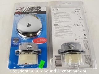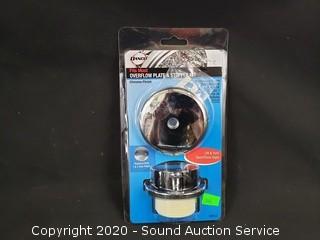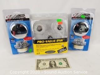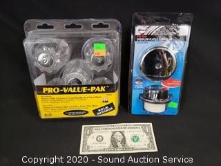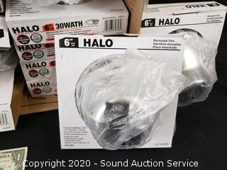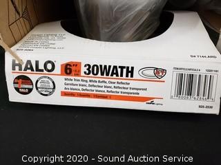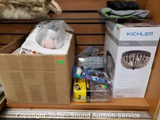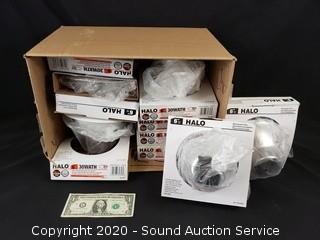 Lot Details: Lavatory Handles, Overflow Plate & Stopper Kits, 10 Halo 6" Recessed Trim Kits, Kichler Coltyn Flushmount Ceiling Fixture.