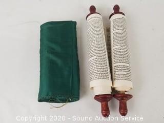 Lot Details: Includes embroidered Star of David tapestry, 4 kippahs, Tefillin with bag and Torah scroll.