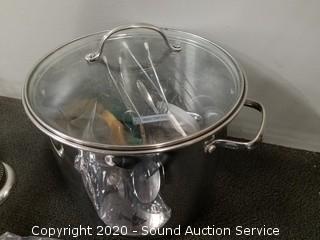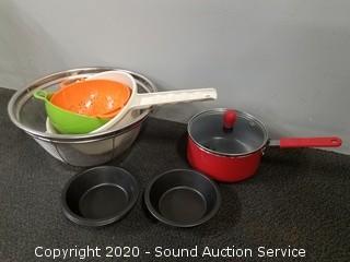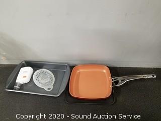 Lot Details: Nice like new Wilson baking pan, red copper skillet, Calphalon flat skillet, various utensils, stainless boiling pot, shredder, grater, strainer and so much more.