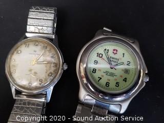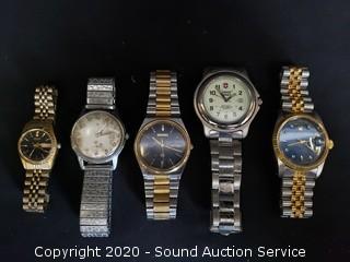 Lot Details: Includes Rolex Oyster perpetual watch (unable to authenticate, do not believe it is genuine), Swiss Army quartz watch, Seiko men's and women's quartz watches and old Hamilton wind up watch (works, some staining on the face). All but the Hamilton are day/date quartz, all quartz watches need new batteries.