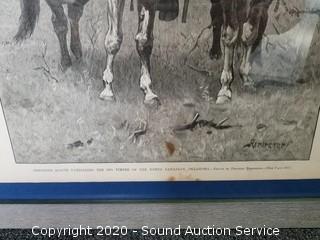 Lot Details: Do not see a signature on the lithograph, might be under the matting, 29.5" x 36". Harper's Weekly Frederic Remington "Cheyenne Scouts Patrolling the Big Timber of the North Canadian, Oklahoma", 20.5" x 26.5". Both framed with glass.