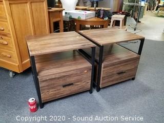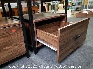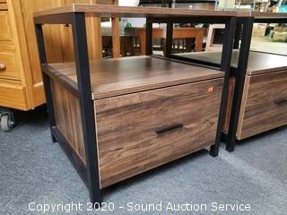 Lot Details: Wood grain finish laminate with matte black steel frame, rolling drawer guides. 22" H x 22" W x 20" D.