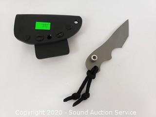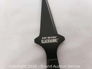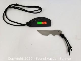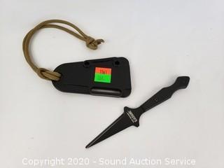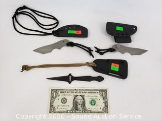 Lot Details: Custom knives are made from a knife maker in the US, no markings. Has a clip on sheath and sheath with necklace lanyard. Fit very snugly in the sheaths. 4-3/8" long. Great knives for backpacking. Throwing knife is a Black Hawk XSF Micro, 6" long.