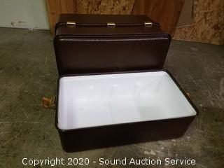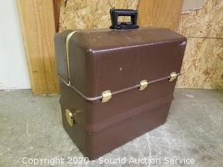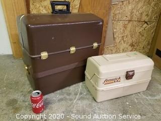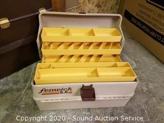 Lot Details: Includes vintage brown plastic tackle box, in good condition, looks hardly used. Only label able to make out is 4500UPB Division of Plastech, 20" x 20.5" x 11.5". Other tackle box is a Fenwick 5.6, 10.5" x 16" x 8.5", in good condition.