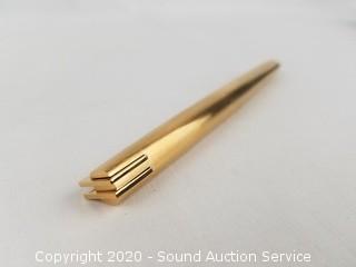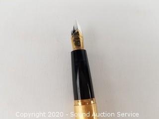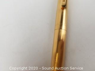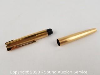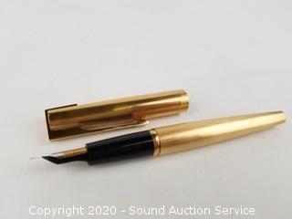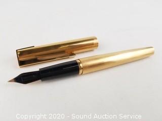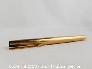 Lot Details: Has an 18k #6 nib, cartridge fill, comes with full cartridge and case. 5-1/2" length. Brushed gold finish.