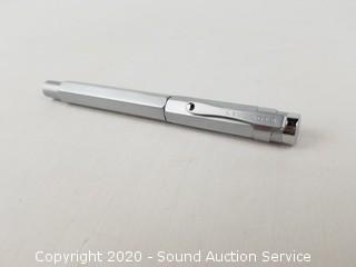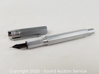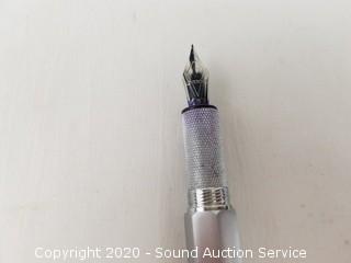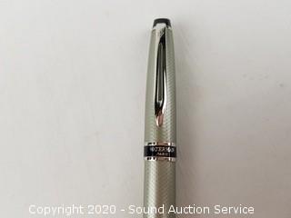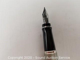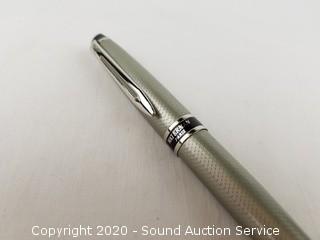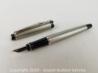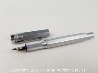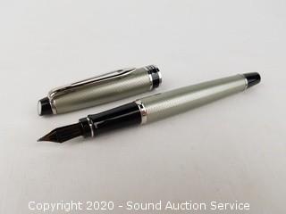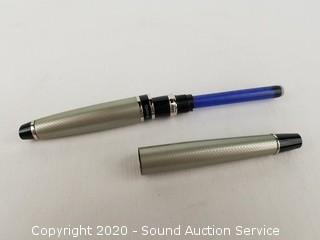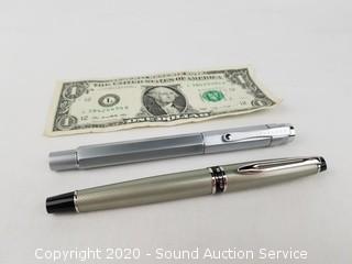 Lot Details: Both are cartridge type, medium point nibs, Waterman has a zig zag pattern. 5-1/2" length, Levenger is machined brass, satin chrome finish, 5-3/8". Both are in excellent condition.