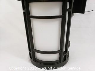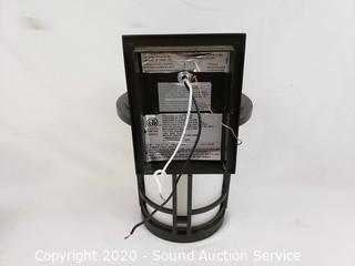 Lot Details: Bronze finish with white frosted glass shade. 14" x 9" x 11". Has been previously installed, some weathering, overall good condition.