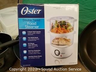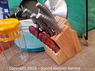 Lot Details: Includes utensils, frying pan, food steamer, plastic food wrap, knife block with knives, rolling pin, storage container.