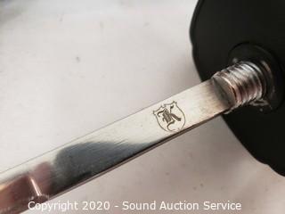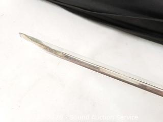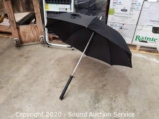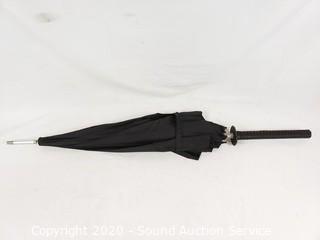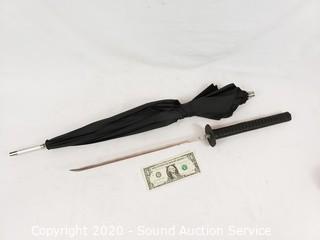 Lot Details: 16/18 stainless steel, 12.5" x 3/8" blade, 25" overall sword. Umbrella is 38" long x 48" diameter. Comes with storage bag.