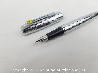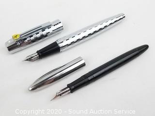 Lot Details: Includes Scuderia Ferrari geometric square pattern, chrome finish, medium nib and piston fill, 5-1/2" length (in excellent condition) and vintage black and chrome finish Sheaffer fountain pen, fill system is corroded (refer to photos), made in USA, 5-1/8" length.