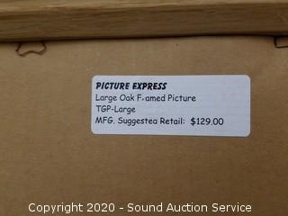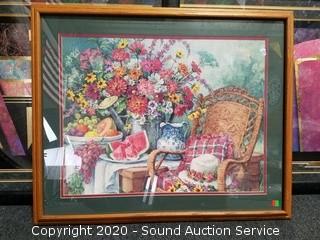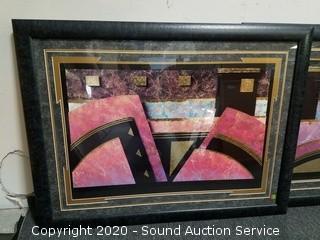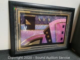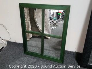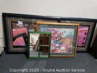 Lot Details: Includes green painted 22.5" x 18.5" mirror, Southern patio scene print 30" x 37" (original $129 price tag on the back) and 2 abstract interior decor artwork 33.5" x 45".