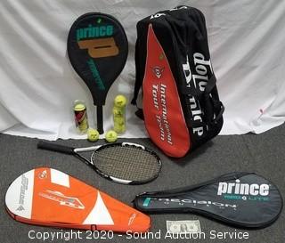 Lot Details: 3 of the rackets have individual bags. Includes Wilson Dunlop 6-Hundred 27.5" racket (108 head size)", Prince Vortex Lite graphite 27" racket (107 sq. in.), Wilson Six-Two Nco 27.5" racket (113 head size) and Prince Precision Aero Lite 550PL 27" racket (107 sq. in.). Comes with a Dunlap bag (holds all 4 rackets) and 9 balls.