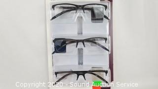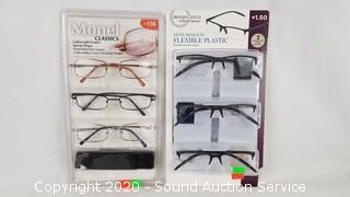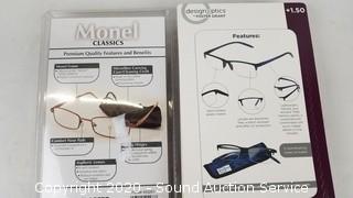 Lot Details: Includes 3 new Monel Classics framed glasses with 3 microfiber cases/cleaning cloths and 3pk Design Optics semi-rimless flexible plastic reading glasses with coordinating cases.
