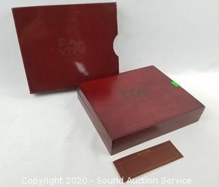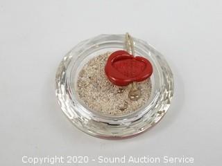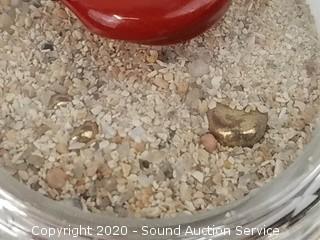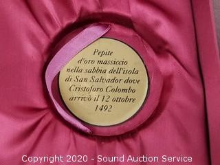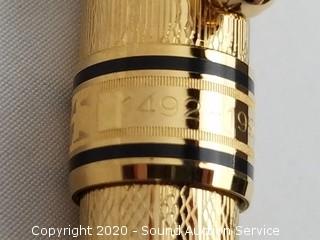 Lot Details: Contains a transparent coffer sealed with wax that contains sand from the island of San Salvador and 3 gold nuggets to represent Christopher Columbus Caravels. Comes with original box and manual. Pen is crafted by master goldsmiths. Serial N0780/1492. Guilloch? pattern. Believe it is sterling silver and gold plated. 5" length.