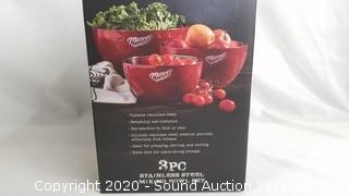 Lot Details: Includes 3-piece red stainless mixing bowl set and 2-piece red stainless colander set.