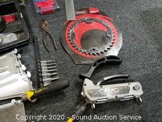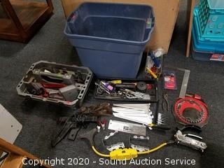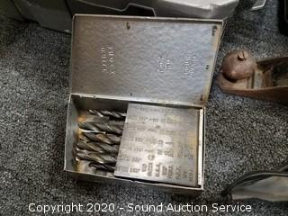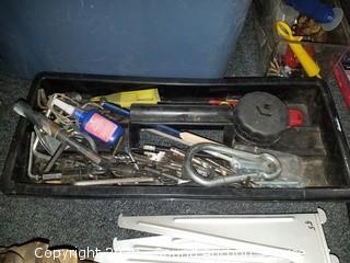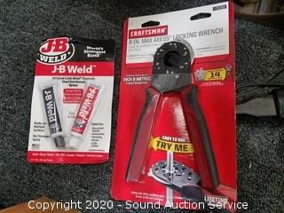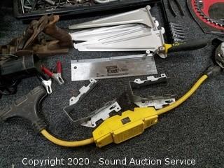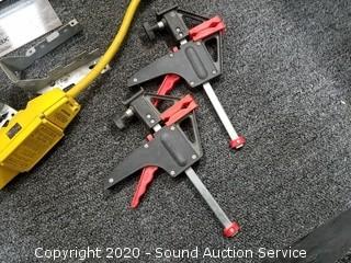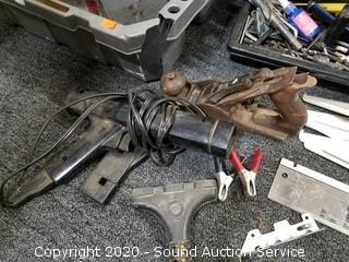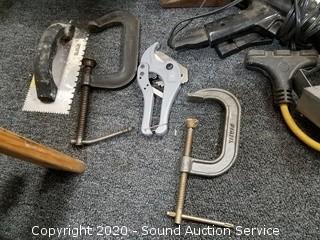 Lot Details: Includes bar clamps, C-clamps, new Craftsman 8" Max Axess locking wrench, JD Weld pipe cutter, drill bit index with bits, timing light, vintage block plane, Paslode red fuel cartridge, jam saw, shelf brackets, tool trays and more.