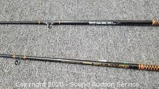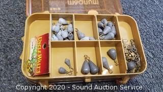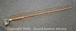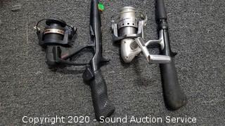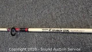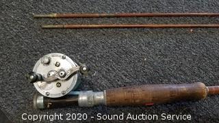 Lot Details: Anchor is a homemade concrete weight. Includes 2pc vintage 6.5ft bamboo rod with South Bend #250 reel, (2) 5.5ft Shakespeare Ugly Sticks with Alpha XT and Avenger AV40 reels, Shakespeare Sturdy Stick 7ft rod with Garcia Mitchell 17A reel, hand net and 2 Plano tackle boxes with various tackle (lure, bait, bobbers, line and more) 4" x 14" x 8.5" and 10" x 11" x 7".