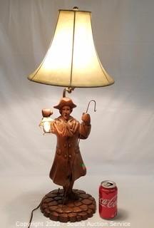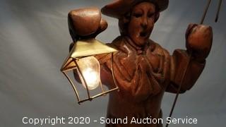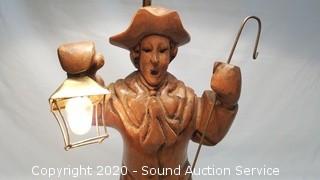 Lot Details: Carved wood figure of a man holding a shepard hook and a lamp. Works. 28" H x 11" Dia. shade.
