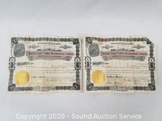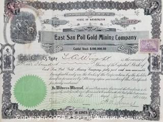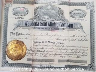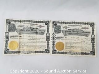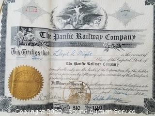Lot Details: Includes 1899 (5000) and (2500) 5-cent shares of Jubilee Gold Ming company, 1911 (10) $1 Shares Pacific Railway company, 1899 (2) (500) 10-Cent shares for Buffalo Legal Tender Development Company, 1890 and 1901 (500) $1 shares Wakanda Gold Mining Company, 1899 (10) 10-cent shares for East San Piol Gold Mining Company.