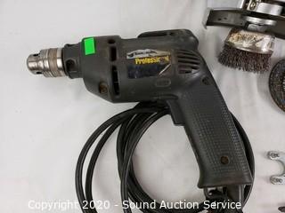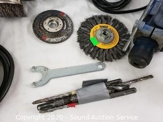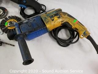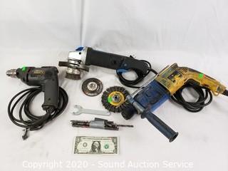 Lot Details: Includes Power Glide 4-1/4" angle grinder (comes with wire cut and disc bits), 3/8" electric drill and DeWalt 7/8" SDS Rotary Hammer (comes with some bits). All work.