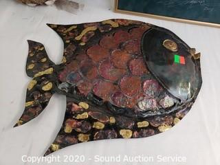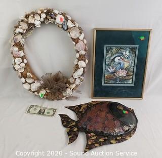 Lot #0206: Metal Art Fish, Sea Shell Wreath & Artwork