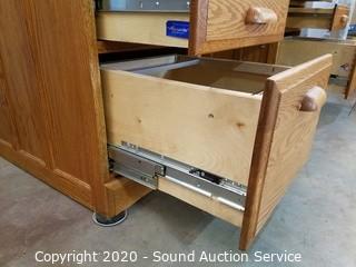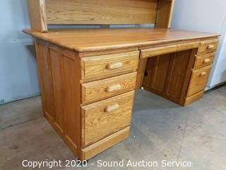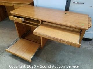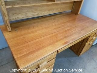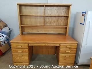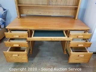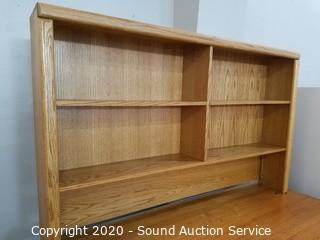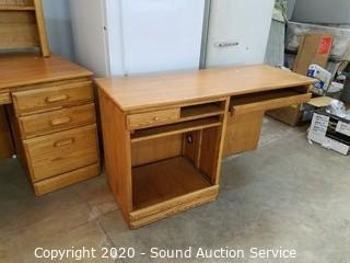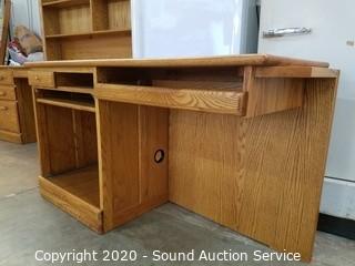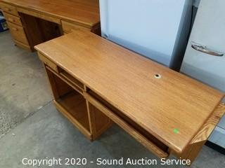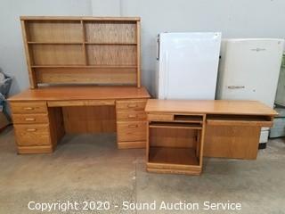 Lot Details: Both look very well made, in good condition. One is 2 piece with bookcase topper. Both have pullout keyboard tables, ball bearing drawer guides, cord holes. One has sectioned drawers with spare dividers & file drawers. 30" H x 51" x 21", 31" x 72" x 35" with a 41" H x 66" x 10" topper. Look like they attach together, definitely match.
