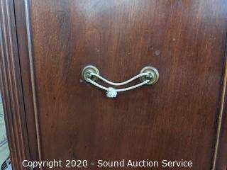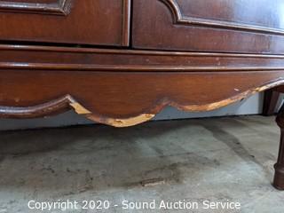 Lot Details: 6 of the drawer pulls are not attached, or broke, comes with a few piece. Has some damage to the edge on the bottom front. Dovetail joinery, 2 of the top drawers are sectioned and felt lined. 36" H x 60" W x 20" D.