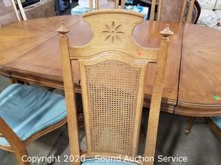 Lot Details: Various wear to the finish. 29" H x (80" with leaves) x 45". Leaves are 18". Chair are cane back, looks like the seats have been reupholstered. One chair is a different pattern of upholstery.