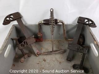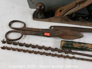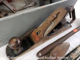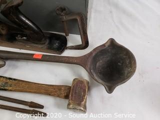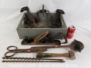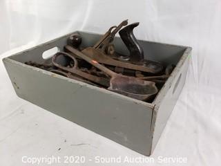 Lot Details: Includes tin snips, steel block plane, brace, augur bits, clamps, melting spoon and hammers. Comes with a 5" x 17" x 12" wood crate.