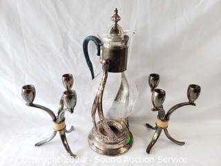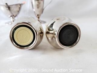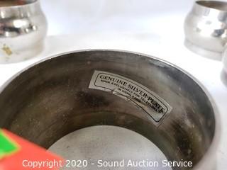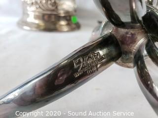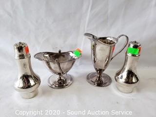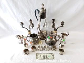 Lot Details: Includes antique 1880s Pairpoint Mfg. Co. quadruple plate cream and sugar dishes, New Port coffee/tea maker, International Silver salt and pepper shakers, 6 napkin rings (4 are Teleflora), Forbes Silver Co. quadruple plate monogrammed cream and sugar and Rogers Bros. "Flair" candelabra set.