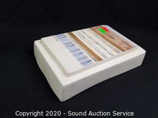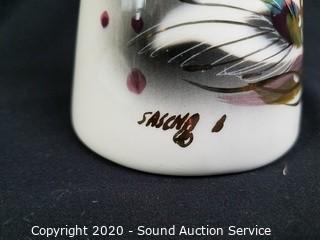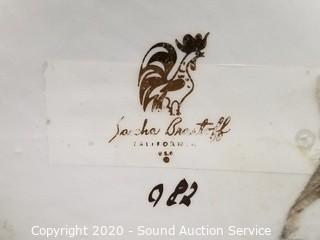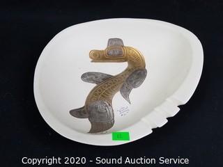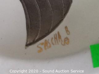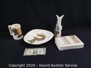 Lot Details: All by artist Sacha Brastoff. Seahorse ash tray, feather vase and turtle mug. Mug has a chip. 9" diameter ash tray, 8" vase and 5" mug, covered dish. 1.5" to 10.5" tall.
