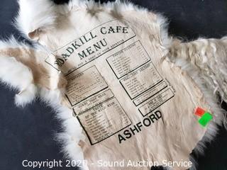 Lot Details: Rabbit pelt is a menu for "Road Kill Cafe", 13" x 10", Ulu comes with stand, very sharp, Hunter Reward print by Duvoe 8" x 12".