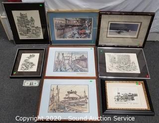 Lot Details: Includes limited Steepletown Apartments/church #7/100 Leroy Schwann 17" x 14", Judy Mandolf plum print 15" x 20", 4 Christopher Paul Bollen sketched titled "Retired" 12" x 15", "Pioneer" 16" x 20", "What's Up Doc?" lithograph 16" x 20", "Lake Union" litho 16" x 20" and "Gingerbread" 16" x 20" and Paul Sloan #446/950 Pikes Place Market print titled "After the Storm" 16" x 20"