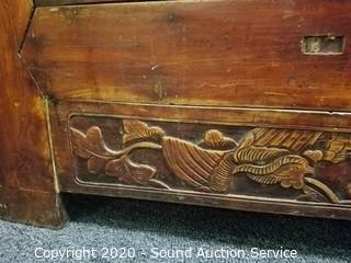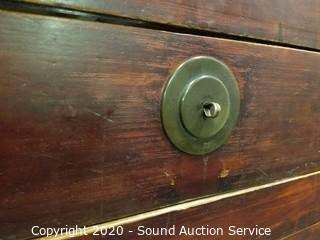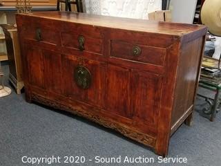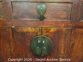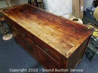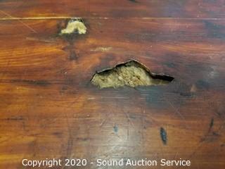 Lot Details: 38" H x 68" W x 26" D. Various wear to the finish giving a nice Olde distressed look. Well made, solid. Has a 2" cord hole cut into the top.