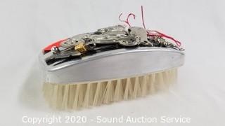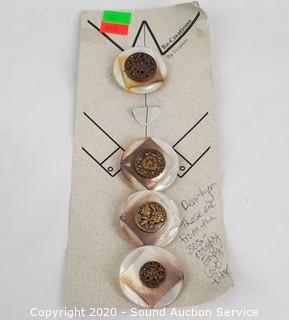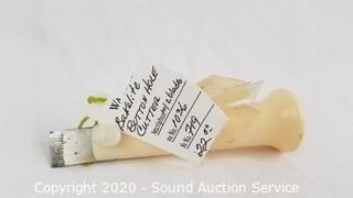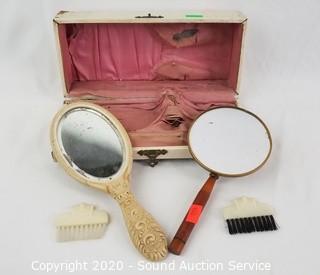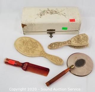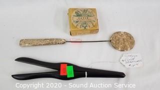 Lot Details: Includes bakelite button hole cutter, 1930s? mother of pearl buttons, vintage glove stretcher, men's stand up collar, combs, brushes, eyeglasses, Avon box and more.