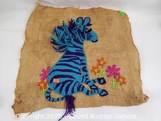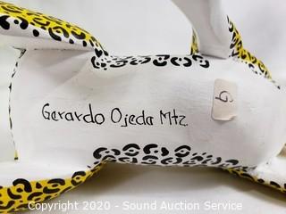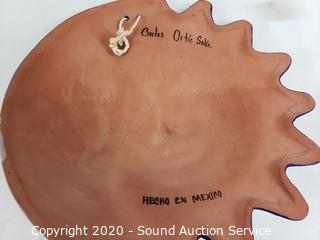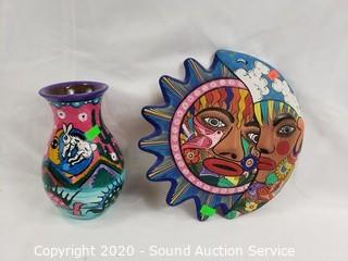 Lot Details: Pair of wood cats signed "Gerardo Ojeda Mtz" and "Pablo Sosa", sun and moon pottery wall decor signed "Carlos Ortiz Solis", wood fish signed "Gaspar Calvo" ($280 price tag on the bottom), vase and embroidered zebra burlap tapestry 16" x 16".