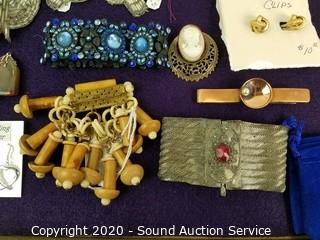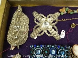 Lot Details: Includes bracelets, necklaces, hair accessories, rhinestones, jade, cameo brooch, shell buckle and more. Case is 1.25" x 11" x 20".
