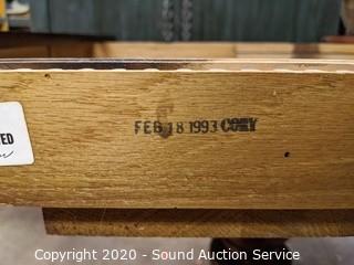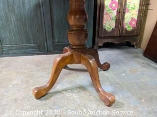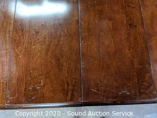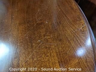 Lot Details: 30" x 41" diameter with (2) 11.5" leaves. Some minor wear to the finish, overall good condition.