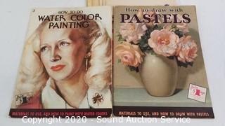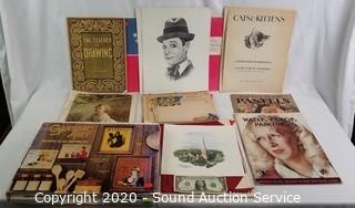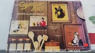 Lot Details: Includes various artwork prints, drawing and painting books, reverse glass painting kit,