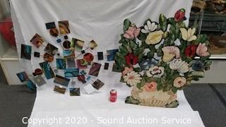 Lot Details: Includes floral potted vase with stand, 36" x 32" signed by artist Ulysse, some weathering and mirrored abstract (do not see a signature) 29" x 41".