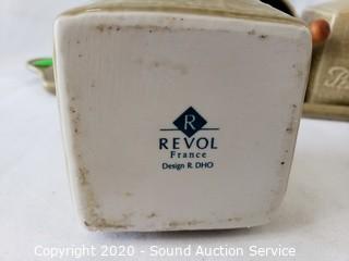 Lot Details: Condiment set is by Revol France, colander with under plate has 2 head embossed maker's mark (refer to photos) and mugs are signed Padilla, set of 6 with rack.