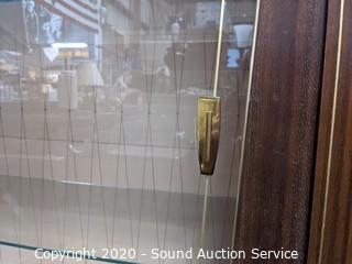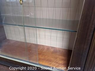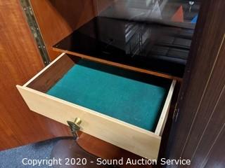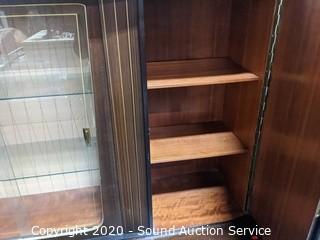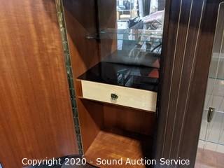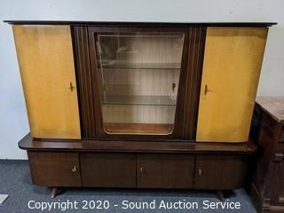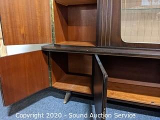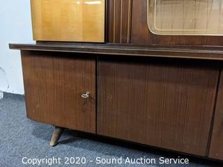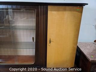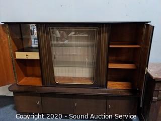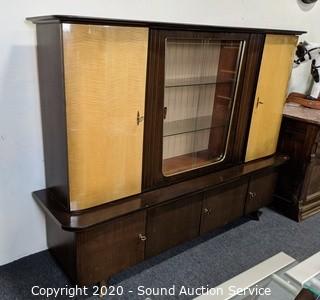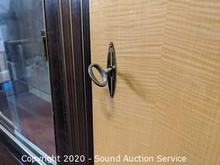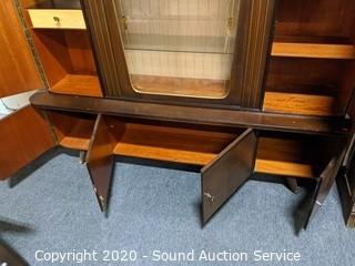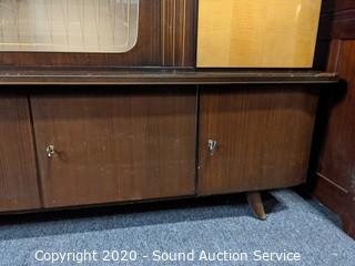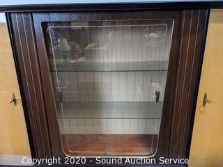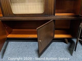 Lot Details: This is a beautiful piece. All the cabinet doors are skeleton key locks with 5 keys. Center sliding glass doors with glass shelves, ingle felt lined drawer in one of the cabinets. Some wear to the finish. 60" H x 77" W x 20" D.