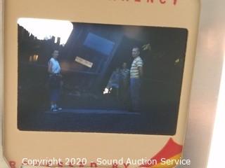 Lot Details: Includes Argus 300 Automatic Slide Projector (cord is damaged, needs replaced, otherwise appears to be in good condition), various color slides (looks to be mostly family photos), Derlia camera and (13) 8mm reels (unknown contents).