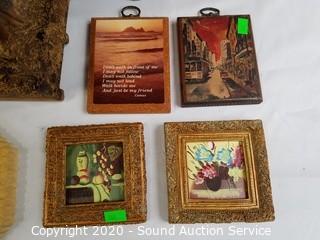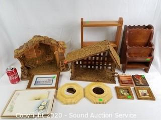 Lot Details: Includes 2 wood mangers, handcrafted, 11" x 15" x 6", knick knack shelf is 15" x 2.75" x 11.5", desktop wood organizer 13" x 7.5" x 7", 7 pieces of wall decor 4" to 6.5" and Lura Special Message stationary.