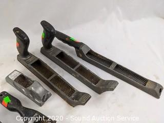 Lot Details: Block plane is a Bailey #5 1/2, (15" long, 2-1/4" blade). Rasps vary from 2.5" to 11".