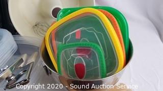 Lot Details: Includes mixing bowls, plastic containers, pizza pan, various utensils, Braun mixer and more.