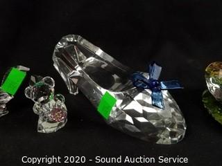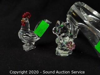 Lot Details: Swarovski crystal Teddy Bear & Rooster, approx. 2". Crystal Heel 2.5" x 4.5" & 3" Swan's.