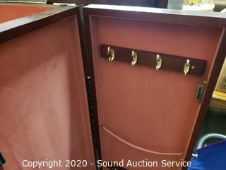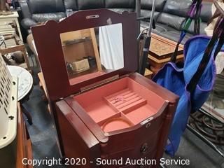 Lot Details: Side access with necklace hooks, locking mirrored top with key, very little wear, in excellent condition. 41" x 38" x 12.5".