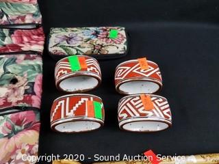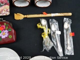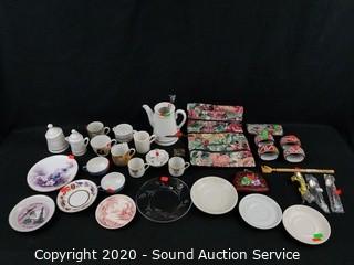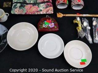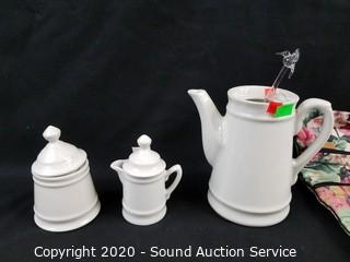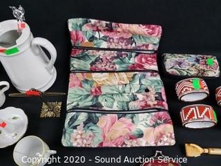 Lot Details: Includes cream, sugar, teapot, stoneware napkin rings, coin pouch, pillowcase, makeup bag, ring holder and more.