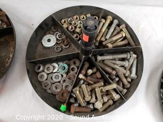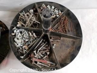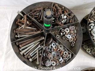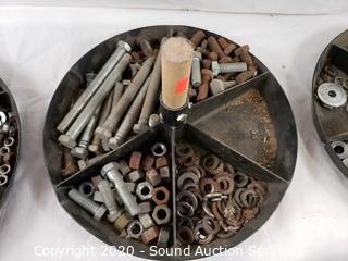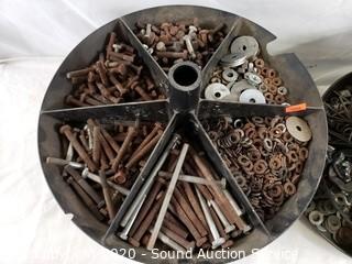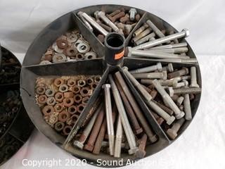 Lot Details: Stack up to 5-high. One is missing a center pole. Each piece is 12" diameter with 6 sections. Loaded with various hardware, nuts, bolts, washers and more.